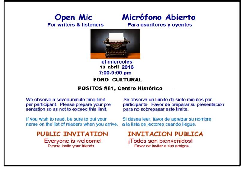 Wednesday, 13 April, from 7:00 – 9:00 pm, at FORO CULTURAL (Positos #81) many of our local writers will be reading samples of recent work in an OPEN MIC event. All are welcome to listen to a wide variety of fiction, poetry and memoir.