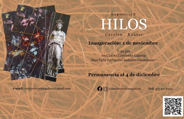 Local artist Carolyn Kantor will present “Hilos” an exhibit of her recent mixed media works, on Friday November 1 at Cuarto Creciente Galería, Juan Valle 22, beginning at 7:30 p.m. Refreshments will be served.