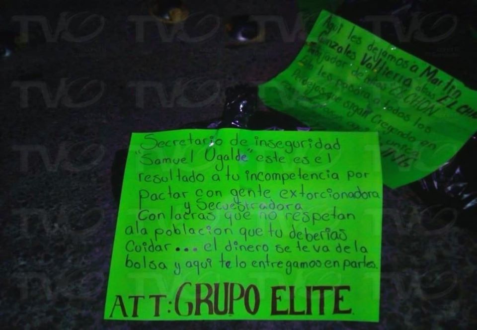 En el lugar también se encontró una cartulina firmada por un grupo de la delincuencia organizada con amenazas para el secretario de seguridad ciudadana Samuel Ugalde García y con acusaciones a las víctimas de ser secuestradores y extorsionadores.