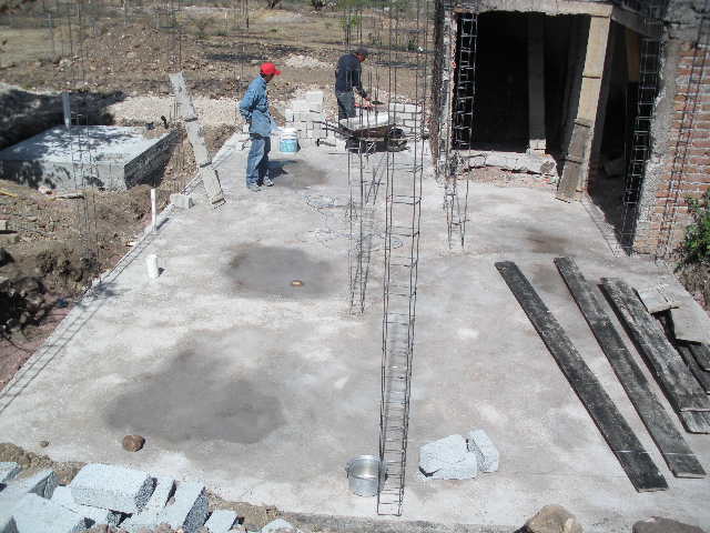 Lalo (16) and Joel worked the entire time I was gone. Senior stone mason, Alejandro, worked nights and weekends, and five helpers came in Saturday, April 27th to get the slab poured. I was stunned at the progress. All the exterior and interior walls are up 12 courses, and the corners are all poured. Both bedrooms, the bathroom, hall, and kitchen can all be seen now. Today, the midway reinforcement row will go in. This step will assure the family that the home is very strong so that they will not be displaced again. The new windows and doors are all metal, no more burnable wood.