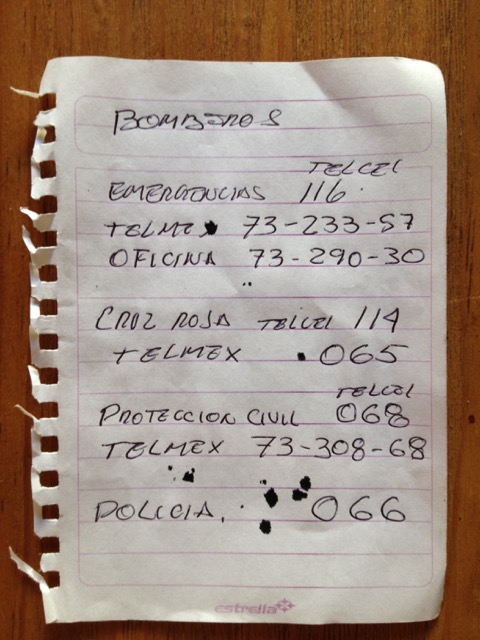 While he was at my house, the fireman gave me a list of direct emergency numbers which I attach here, just as he wrote them on his notebook page. Note that the numbers are different if you are calling from TelCel or from TelMex. Only the police number is the same.